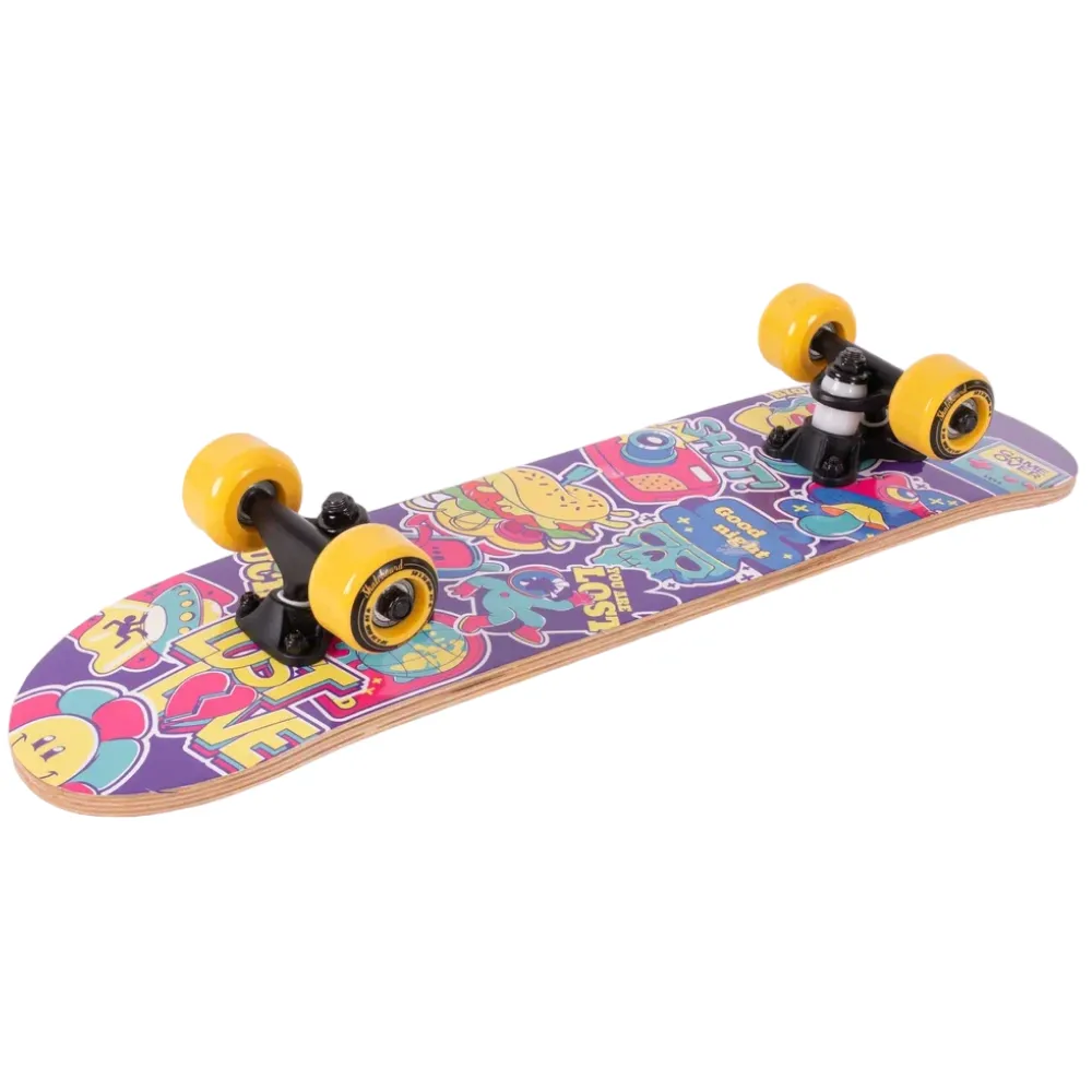 Скейтборд Tech Team Profi 2024 желтый - это смелый выбор для тех, кто ценит качество и стиль. С этим скейтбордом вы заметите, как город оживает под колесами из полиуретана размером 50x36 мм, обеспечивающих оптимальную жесткость 85А. Дека из 9 слоев прочного китайского клена гарантируют устойчивость и долговечность, а ее размеры 24”х6” обеспечивают максимальный комфорт при катании. Верхняя часть покрыта чёрной шкуркой 80AB для непревзойденного сцепления, а нижняя часть украшена эксклюзивным принтом в жёлтых тонах, вдохновленным винтажными наклейками. Скейтборд оснащен подшипниками ABEC 5 для плавного и быстрого движения, а двойной концевой загиб Деки (Double Kick) позволяет выполнять трюки с легкостью. Это не просто скейтборд, это способ выразить себя.