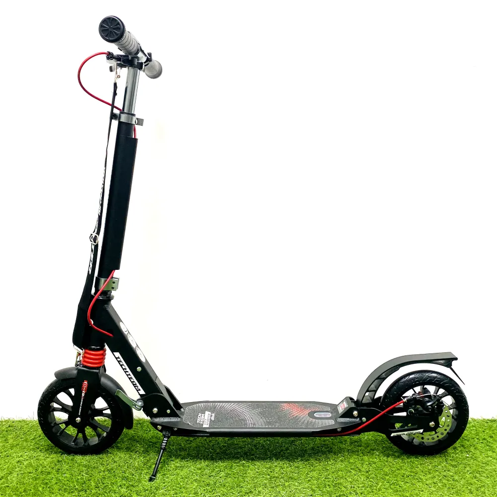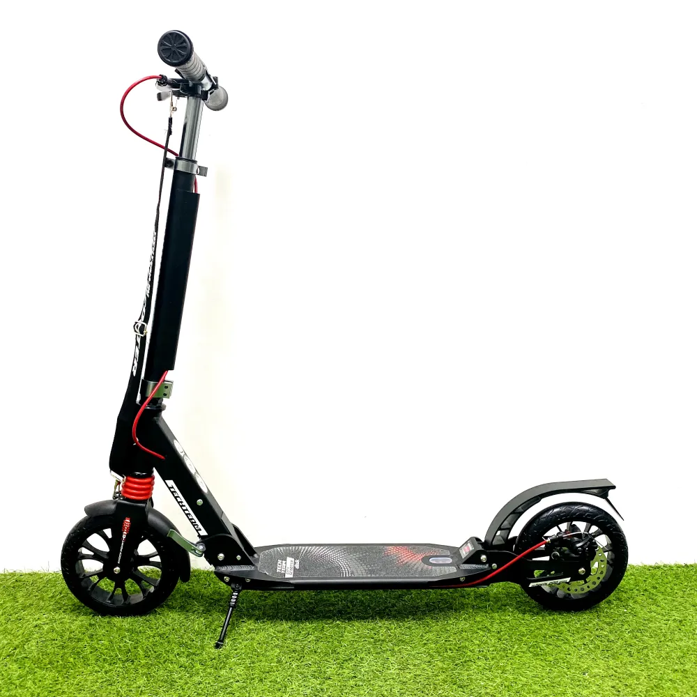 Визуально самокат ничем не отличается от взрослого. Модель оснащена мало стираемыми колесами, передними и задними амортизаторами, делающими движение плавным и беспроблематичным. Характеристики самоката обеспечивают безопасную скоростную езду по городской местности и парковой зоне.
